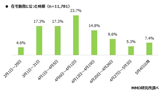 新型コロナウイルス感染症の影響で「在宅勤務」「時差出勤と在宅勤務の並行」「過去に在宅勤務を行っていた」と回答した人(1万1781人)を対象に、在宅勤務となった時期を尋ねた質問では、東京や大阪などに緊急事態宣言が発令された時期である4月第2週の「4月6日~4月12日」(23.7%)が最多だった。4月以降に在宅勤務となった人は、78.1%に達している。