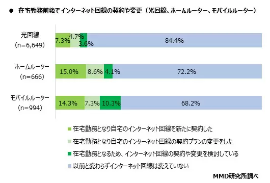 新型コロナウイルス感染症の影響で「在宅勤務」「時差出勤と在宅勤務の並行」「過去に在宅勤務を行っていた」人に、在宅勤務の前後で自宅のインターネット回線を新たに契約したり、変更したりしたかを尋ねた質問では、在宅勤務で新たに「光回線」を契約した人は7.3%、「ホームルーター」を契約した人は15.0%、「モバイルルーター」を契約した人は14.3%となっている。