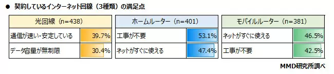 それぞれの回線の満足点としては、「光回線」で「通信が速い・安定している」、「ホームルーター」で「工事が不要」、「モバイルルーター」で「ネットがすぐに使える」が最多だった。