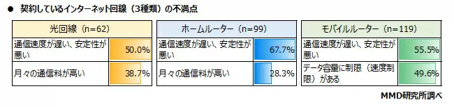 それぞれの回線の不満点は、いずれの回線も「通信速度が遅い、安定性が悪い」が最多で、次点として「光回線」と「ホームルーター」で「月々の通信料が高い」、「モバイルルーター」で「データ容量に制限(速度制限)がある」が続いている。