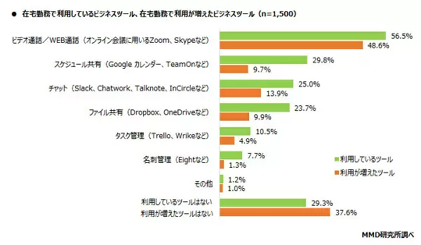 在宅勤務に利用しているビジネスツールと、在宅勤務で利用が増えたビジネスツールを尋ねた質問(複数回答)では、「ビデオ通話/ウェブ通話」を利用している人が56.5%、利用が増えた人が48.6%で、どちらも最多となった。