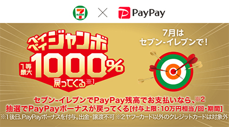 7月の月替わりキャンペーンでは、対象をセブン-イレブンに変えて「ペイペイジャンボ(オンライン)」が実施される予定。PayPay残高、ヤフーカード、PayPayあと払いで決済すると、1等当選者に決済金額の10倍、2等当選者に決済金額相当、3等当選者に決済金額の5%のPayPayボーナスが付与される。還元上限は10万円/回・期間。