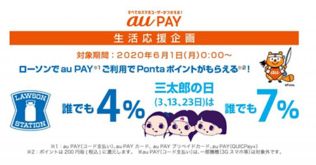 au PAYは6月1日からローソンで、Pontaカード提示・au Pay決済で最大11%を還元するキャンペーンを開催。auユーザーとそれ以外で還元率に違いはあるが、3日・13日・23日の「三太郎の日」が特にお得になる。6月15日には、出前館とピザハットを対象にしたキャンペーンもスタート。au PAYカードもしくはau PAYプリペイドカードで決済すると、ポイントを10%還元する。9月13日までと実施期間が長いのもうれしい。
