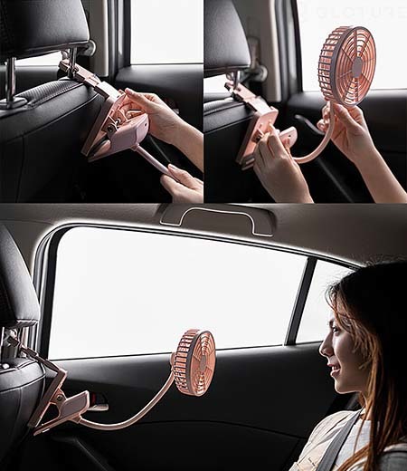 クリップと柔軟に曲がる本体で、机の角やベビーカー、エアコンの空気が届きにくい車の後部座席などに自在に取り付けられるのが魅力だ。クワイエットブルーとチェリーブロッサムピンク、パールホワイトの3色で、直販サイトの価格は、2個セットで4500円、3個セットで6000円。
