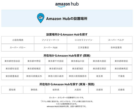 Amazon Hubは、店舗スタッフが受け渡しを行う「Amazon Hub カウンター」と自身で受け取る「Amazon Hub ロッカー」の二つ。保管期間は、ロッカーの場合は3日以内、カウンターの場合で14日以内。当初、小田急線駅構内など限定されていたAmazon Hub ロッカーは、パートナー企業の増加とともに、スーパーやドラッグストアにも拡大している。