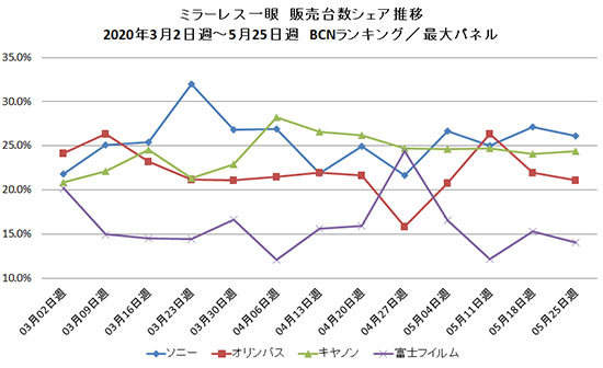 メーカー別シェアの推移をみると、春商戦は上位3社の競り合い(わずかにソニーが優位に進めた)で、ピンポイントで富士フイルムがトップ争いに参戦してくる場面もあったことが分かる。