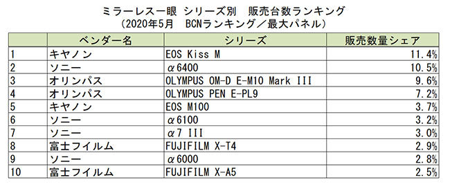 シリーズ別の販売台数シェアランキングでは、前月から大きな変動がない。キヤノン「EOS Kiss M」が11.4%でトップ。2位にソニー「α6400」(10.5%)、3位にオリンパス「OLYMPUS OM-D E-M10 Mark III」(9.6%)がランクインした。緊急事態宣言は解除されたものの、観光やレジャーの自粛は継続しており、カメラ市場が持ち直すにはもう少し時間がかかりそうだ。(BCN・大蔵 大輔)