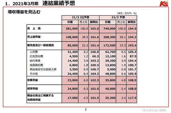 販売管理費は、前年比103.4%と予想。チラシの自粛で広告宣伝費は減るが、固定費は営業時間が短縮されても大幅な減少が見込めず、また人件費はベアで増加になると予想する。