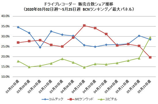 メーカー別では、コムテックが62.9%、JVCケンウッドが52.4%、ユピテルが78.3%。4月はJVCケンウッドがシェアを伸ばしたが、5月は3社がもつれる展開になった。5月25日週は、ユピテルが急上昇してトップに立った。