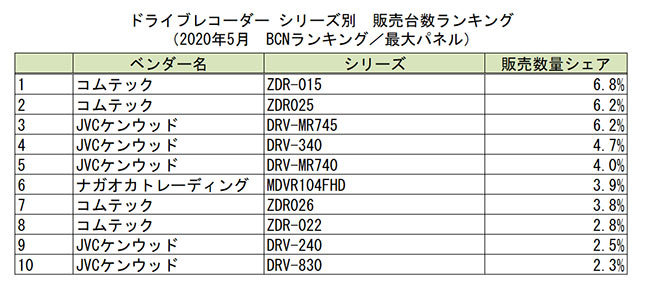 機種別の販売台数シェアランキングでも、コムテックが上位を独占。「ZDR-015」が1位に、「ZDR025」が2位にランクアップした。ベストテンの製品数はJVCケンウッドが最多で、5製品がランクインした。(BCN・大蔵 大輔)