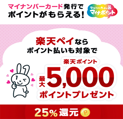 楽天カードまたは楽天ペイ(アプリ決済)で申し込んだ場合は、各サービスによる決済の利用額に応じた楽天ポイントが、また楽天Edyで申し込んだ場合は、チャージ金額に応じたEdyが還元される。楽天ペイ(アプリ決済)は、期間限定ポイントも含め楽天ポイントで支払いをした場合もマイナポイント還元の対象となる。