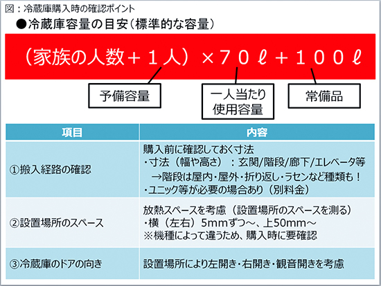 【家電コンサルのお得な話・13】 新型コロナウイルス(第1波)による外出自粛の巣ごもり消費で家電製品では焼肉専用機やたこ焼き器などを始めとする調理家電の販売が好調だった。ご自宅で家族揃って内食を楽しんだ方も多かったことだろう。そんな内食用食材のまとめ買いで、今まで意識していなかった冷蔵庫の容量不足に漠然とした不満を持たれた方も多いと思う。最適な容量の決め方や買い替える際のチェックポイントを紹介しよう。