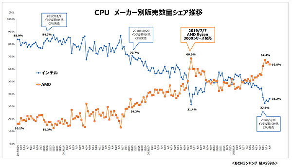 新型コロナウイルス対策として政府が提唱する「新しい生活様式」の中で、テレワークやリモート授業が推奨され、これまで一家に1台だったノートPCが、1人1台になろうかという勢いで売れている。これからPCを購入しようとする人にとって、店頭でAMD製CPUの「Ryzen」を見かける機会が増えるだろう。全国の主要家電量販店・ネットショップのPOSデータを集計した「BCNランキング」によると、単体CPUの販売数量シェアでAMDが7割近くに再浮上し、Ryzen旋風が吹き荒れている。