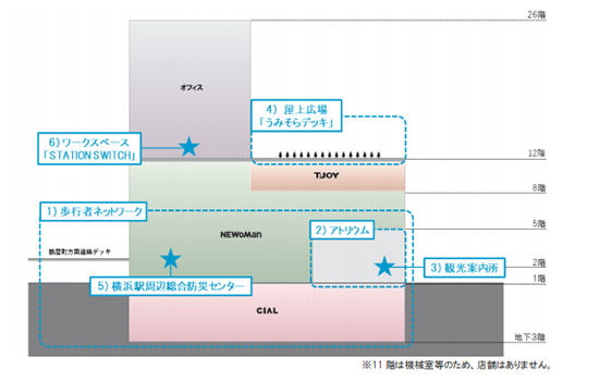 JR横浜タワーの開業により、横浜駅周辺の回遊性が高まる。JRだけでなく東急東横線やみなとみらい線との接続や、近隣施設の相鉄ジョイナスや横浜モアーズにもスムーズな移動が可能になる。合わせて、待ち合わせや憩いの場など複数のオープンスペースのほか、官民連携による「観光案内所」や「横浜駅周辺総合防災センター」などもオープンする。