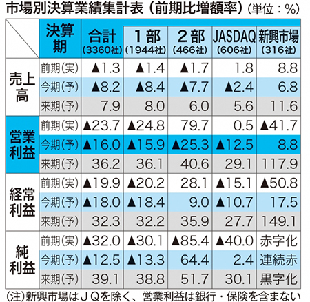 四季報予想を集計した結果、上場企業の今期(20年4月期~21年3月期、対象3360社)営業利益は16.0%減と、前期の23.7%減に続き2期連続で2ケタ減益の見通しとなった。四季報では、企業活動が7月以降に徐々に回復に向かうとの前提を置いている。