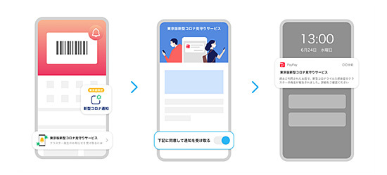 ユーザーはPayPayアプリでクラスター発生情報の通知を許諾すると、ユーザーがPayPayを使って決済した東京都内の加盟店舗で新型コロナのクラスターが発生した場合、決済履歴に基づいて店舗名やクラスター発生日時などの情報を知らせてくれる。