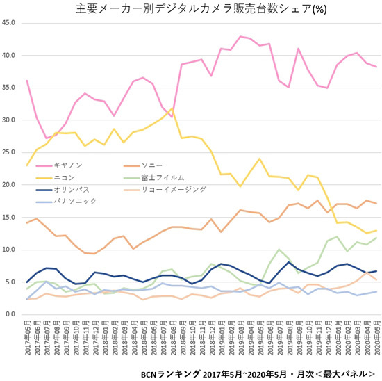 しかし18年夏以降、コアな層を取り込むニッチ戦略が成功した富士フイルムに追い抜かれ、19年の年末商戦では、5位が定位置になってしまった。同じマウントで製品展開するパナソニックも7位に甘んじており、マイクロフォーサーズ陣営はこのところ、ぱっとしない状況だ。