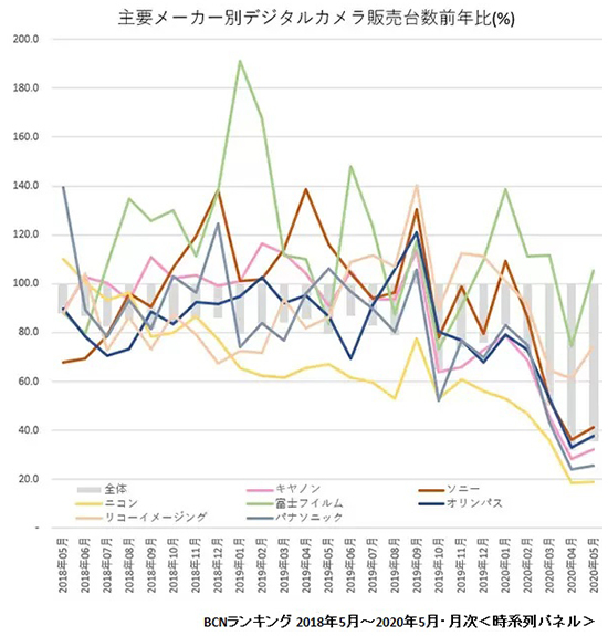 カメラ業界全体も前年割れの連続で苦境にあえいでいる。特にこの4月、5月はコロナ禍の影響をもろに受け、前年比で7割減まで急激に落ち込んだ。オリンパスも同じく販売縮小に苛まれている。18年5月から20年5月まで、販売台数の前年同月比で、前年を上回ったのはわずか3回だけ。残りのほとんどの月は2ケタ割れが続いた。