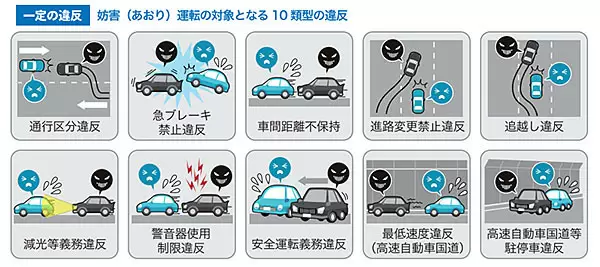 あおり運転の対象となる違反は、次の10種類となる。対向車線を走行する「通行区分違反」、前方車が急ブレーキをかける「急ブレーキ禁止違反」、後続車が前方車との車間距離を詰める「車間距離不保持」、急な割り込みによる「進路変更禁止違反」、危険な「追い越し違反」、執拗なパッシングやハイビームなどの「減光等義務違反」、執拗にクラクションを鳴らす「警音器使用制限違反」、車幅を寄せたりする「安全運転義務違反」、高速道路での「最低速度違反」、高速道路で停車する「高速自動車国道等駐停車違反」である。