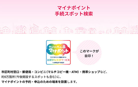 総務省のマイナポイント事業のウェブサイト内の「マイナポイント手続スポット検索」(https://mynumbercard.point.soumu.go.jp/reserve_search/)からは、都道府県と市町村名、種類(支援端末/コンビニのマルチコピー機)からマイナポイントを予約できるスポットを検索できる。