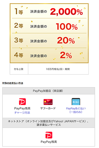 全ての決済参加者にポイントが還元されるわけではなく、宝くじのような抽選方式をとる。1等が当たると決済金額の最大10倍(1000%)、2等が当たると決済金額の同額(100%)、3等が当たると決済金額の5%のPayPayボーナスが付与される。