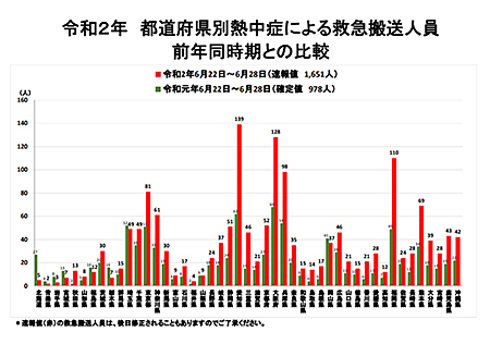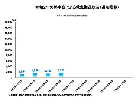 総務省消防庁が発表している熱中症情報によると、6月22日~6月28日の1週間に全国で熱中症で救急搬送された人数は速報値で1651人。前週の1461人から増加。前年の同時期(978人)と比較しても高い数値となった。