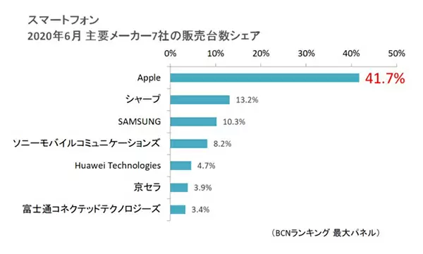家電量販店の実売データを集計した「BCNランキング」によると、Appleの2020年6月のメーカー別販売台数シェアは41.7%。長年スマートフォンのメーカー・タイプ別の販売動向をウォッチしてきた記者の独自の定義によると、シェア6割を超えると「販売好調」、シェア4~5割は「平常」であり、4割を切ると「低調」となる。毎年6月~8月は、次期iPhoneの信頼度の高いリーク情報が出始め、新モデル待ちの買い控えの傾向が強まる時期なので、今春の「iPhone SE(第2世代)」の投入が奏功したようだ。