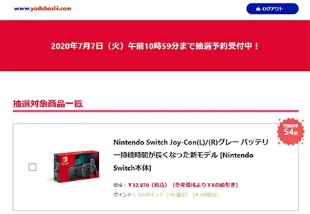 ヨドバシカメラは、同社のECサイト「ヨドバシ・ドット・コム」で「Nintendo Switch(ニンテンドースイッチ)」本体や「リングフィット アドベンチャー」の抽選販売の応募を7月7日10時59分まで受け付けていた。申し込みページでは、当選倍率が公開されていた。