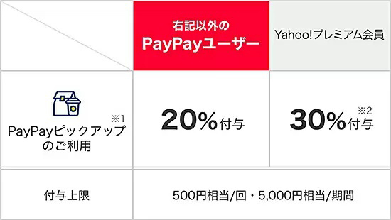 PayPayピックアップデビューキャンペーンでは、事前注文サービスのPayPayピックアップを利用して対象の飲食店が提供するテイクアウト(店頭持ち帰り)商品の代金を支払った際、支払い金額の20%分(「ソフトバンク」または「ワイモバイル」のスマートフォンユーザーと、「Yahoo!プレミアム」会員が30%分)の「PayPayボーナス」が戻ってくる。