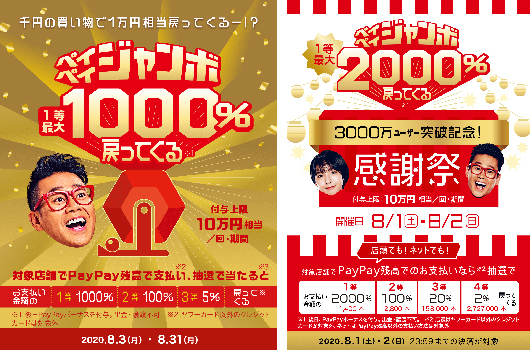早くも発表されている8月のキャンペーンは、「まちのお店でペイペイジャンボ」と「3,000万ユーザー突破記念!大感謝ジャンボ」の2本立てとなる。前者は、PayPayが指定した中小規模の加盟店で決済金額の最大10倍を還元。後者は、8月1日・2日の2日間限定キャンペーンで、期間中にPayPayを利用すると5回に1回の確率で最大20倍を還元する。