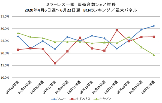週次のシェア推移では6月に入り、ソニーがさらに勢いを増し、6月22日週は30%を超えた。オリンパスも追い上げて25%前後を維持している。キヤノンは6月8日週を境に急落し、6月22日週は20%を下回った。
