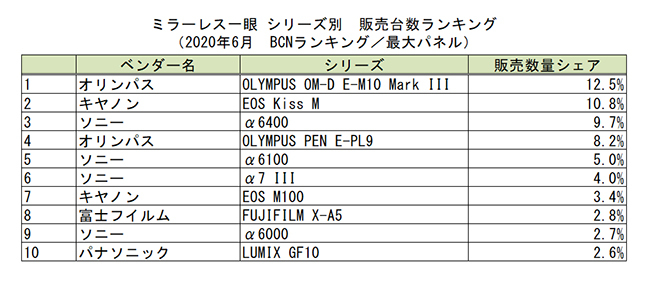 シリーズ別の販売台数シェアランキングでは、オリンパスの「OLYMPUS OM-D E-M10 Mark III」が12.5%で首位を獲得。2位にキヤノンの「EOS Kiss M」、3位にソニーの「α6400」がランクインした。