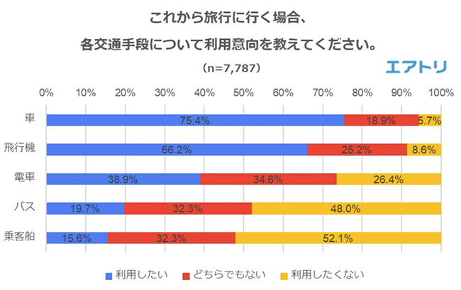 旅行する際の交通手段については、三密が回避できる「車」(75.4%)がもっとも高く、次いで「飛行機」(66.2%)、「電車」(38.9%)、「バス」(19.7%)、「乗客船」(15.6%)と続いた。
