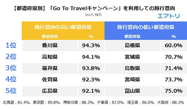 Go To キャンペーンを使って旅行したい都道府県別では、香川県や高知県、福井県、佐賀県、広島県など感染者数の少ないところが上位になった。もっとも、旅行意向が低い都道府県でも島根県や宮城県、鳥取県、宮崎県、富山県など感染者数の少ないところが上位になっている。