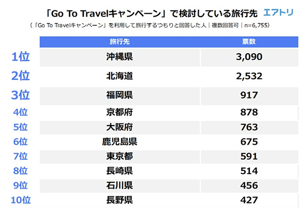 さらに、より旅行意向の強い「Go To キャンペーンを利用して旅行するつもり」と回答した人(n=6755、複数回答)に絞ると、沖縄県、北海道、福岡県がトップ3となった。医療体制が整っていない沖縄県や感染者数の多い北海道などの影響はあまり関係なく、観光地として根強い人気を示した。
