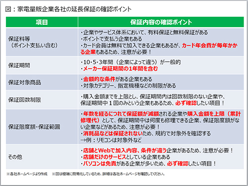 【家電コンサルのお得な話・15】 家電量販業界に長期延長保証サービスが取り入れられて、もう20数年になる。今では当たり前になっているが、サービスは一律ではなく、企業によって加入条件や保証内容が異なるため、消費者の視点からすると非常に比較しにくいサービスの一つとなっている。しかし、いざ家電製品が故障した際はとても頼りになるサービスだ。そこで、延長保証でチェックすべき重要項目をまとめた。