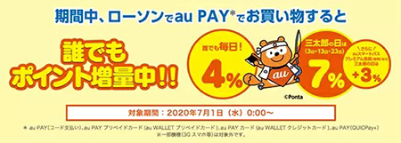 どちらもau PAYで支払うと、通常付与するポイントに加え、月3000ポイントまで、キャンペーンポイントが付与される。ローソンのキャンペーンは終了日未定。Ponta連携店舗のキャンペーンは、7月31日23時59分までとなっている。