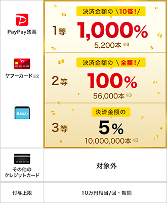 同キャンペーンは、1000%還元の1等当選者に決済金額の10倍、100%還元の2等当選者に決済金額の全額、3等当選者に5%のPayPayボーナスを付与するというもの。還元上限は10万円相当/回・期間。
