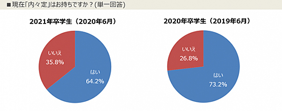 6月末時点で内々定を得ている学生は64.2%で、昨年同時期比9.0ポイント減少した。新型コロナウイルスの影響で、緊急事態宣言期間中に会社説明会や選考を一時中断する企業が相次いだことで、内々定獲得時期が、昨年より遅くなっていることが、内々定率に表れる結果となった。