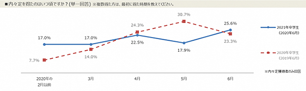内々定を得たタイミングは「2月以前」が17.0%で、昨対比9.3ポイント増加する一方、「5月」は17.9%で、昨年より12.8ポイント低く大幅減となった。