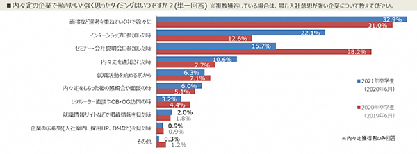 「内々定を得た企業で働きたいと強く思ったタイミング」でも、「インターンシップに参加したとき」が22.1%で、昨年よりも9.5ポイント高い結果となっている。6月末時点で内々定を得ている学生は、インターンシップなどを通して早期に企業と接触している学生の割合が高くなっており、インターンシップ参加の有無によって、内々定獲得状況が“二極化”する傾向となっている。