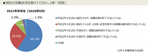 内々定を獲得している学生の就職活動状況では、「内々定先に満足したので、就職活動を終了する」(59.2%)、「内々定先に満足しているが、より良い企業を探すために就職活動を続行する」(28.9%)となっており、約9割の学生が内々定先に満足していることが分かった。