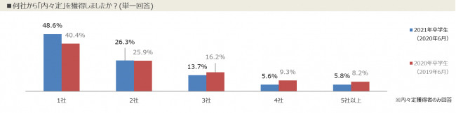 内々定を得ている学生の内々定獲得社数は、「1社」が48.6%に対し、「2社」(26.3%)、「3社」(13.7%)、「4社」(5.6%)、「5社」(5.8%)となっており、半数以上(51.4%)が「2社以上」から内々定を獲得している。すでに内々定を得ている学生に、内々定が集中していることがうかがえる結果となった。