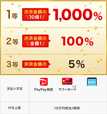 当選内容は、1等が決済金額の最大10倍(1000%)、2等が決済金額の同額(100%)、3等が決済金額の5%。対象となる支払方法は「PayPay残高」「ヤフーカード」「PayPayあと払い(一括のみ)」。付与上限は10万円相当/期間。