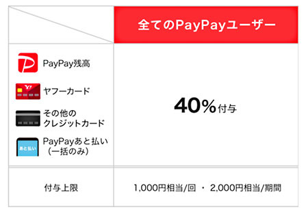 PayPayでの支払いは、PayPay残高、ヤフーカード、そのほかのクレジットカード、PayPayあと払い(一括のみ)のすべてのPayPayユーザーが対象。付与上限は1回当たり1000円相当。期間中の上限は2000円相当となる。PayPayボーナスの付与は11月下旬ごろの予定。