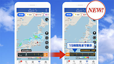 従来の雨雲レーダーCh. Zoomモードと比較すると、250mメッシュ/10分間隔という高解像度を保ちつつ、対象時間を3時間から15時間へ大幅に延長したことになる。また、3時間先-15時間先までの雨雲レーダーの時間解像度を、既存の1時間間隔から10分間隔へ、空間解像度を既存の1~5kmメッシュから250mメッシュへハイレゾリューション化している。15時間先までの雨雲の動きを、90枚以上のレーダー画像で滑らかに表現することで、雨の降り出しや降り止み、降り方の強弱などの詳細な変化がより直感的に分かりやすくなった。