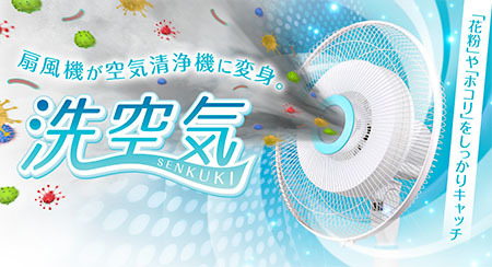 洗空気は、一般の扇風機に取り付けて使用できる高除去率の使い捨て空気洗浄フィルター。扇風機の羽を外して取り替えるだけで、空気清浄機に早変わりする便利な商品となっている。オフシーズンの扇風機や使用していない扇風機を、必要に応じて花粉・ハウスダスト対策として有効活用することができる。