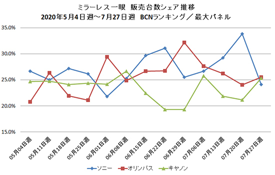 週次のシェア推移では、6月中旬~7月上旬にかけてソニーとオリンパスがキヤノンに差をつけていたが、7月中旬以降、キヤノンも急回復。3社による大接戦の様相となっている。