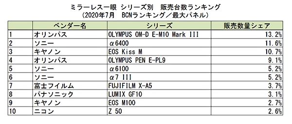シリーズ別の販売台数シェアランキングでは、オリンパスの「OLYMPUS OM-D E-M10 Mark III」が首位をキープ。前月の12.5%から0.7ポイント上げた。各社の新製品リリースも続々と発表されており、それを起爆剤に市場を押し上げられるかに注目が集まる。(BCN・大蔵 大輔)