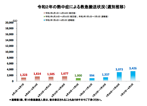 総務省消防庁が発表している熱中症情報によると、7月27日~8月2日の1週間に全国で熱中症で救急搬送された人数は速報値で3426人。前週の3073人から微増となった。